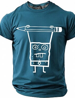 T-shirt homme style cartoon rétro, col rond, manches courtes, motif humoristique représentant un bonhomme bâton tenant un crayon géant. Idée cadeau pour homme, couleur turquoise.