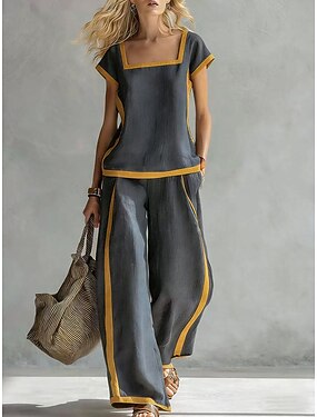 Femmes Ensembles de Pantalons Manche Courte Col carré Bloc de Couleur Patchwork Vacances ancien Quotidien Quotidien Fête Sortir Bleu Noir Blanche Été Coupe Ample