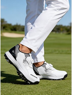Chaussures de golf pour homme, en similicuir blanc avec fermeture Boa ajustable, confort optimal, semelle antidérapante, idéales pour le golf, les sports de plein air et un mode de vie actif.