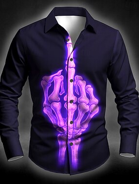 Chemise à boutons à manches longues pour hommes à motifs doigt d'honneur de squelette style punk gothique sombre extérieur vacances été printemps col avec imprimé 3D bleu violet orange
