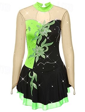 Robe de Patinage Artistique Femme Fille Patinage Robes Tenue noir vert Patchwork Spandex Fil élastique Haute élasticité Compétition Tenue de Patinage Classique manche longue Patinage Artistique
