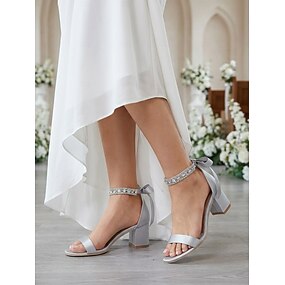 Sandales argentées à talons carrés pour femmes, chaussures de mariée à bout ouvert et bride cheville ornée de cristaux pour les mariages à l'église