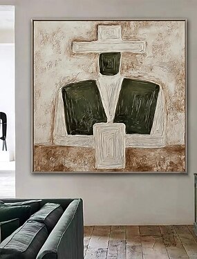 Grande peinture à l'huile abstraite géométrique beige crème, style wabi-sabi moderne, art mural minimaliste marron et noir, peinture texturée beige