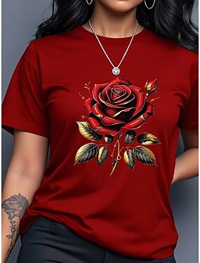 Femmes T-shirt Imprimé Fleuri Graphique Plantes ancien Élégant Classique Manche Courte Col ras du cou Hauts Réguliers Quotidien Sortir Week-end Noir Rouge Été