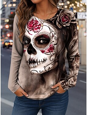 T-shirt Femme Crânes Graphiques Mode Décontracté Manches Longues Col Rond Tops Normaux Quotidien Week-end Imprimé Rouge Bleu Violet Vert Kaki Printemps Automne Hiver