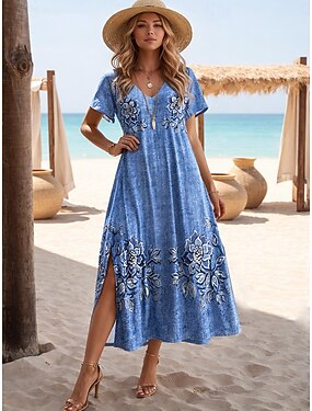 Femmes Robe maxi Robe trapèze Occasionnel Quotidien Coupe régulière Fleuri Graphique Manche Courte Col en V Bleu Été Printemps