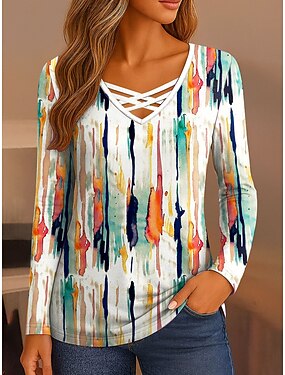 Femmes T-shirt Découpé Imprimé Graphique Géométrique ancien Élégant Occasionnel manche longue Col en V Hauts Réguliers Quotidien Bleu Rouge Bleu Roi Violet Vert Printemps Automne