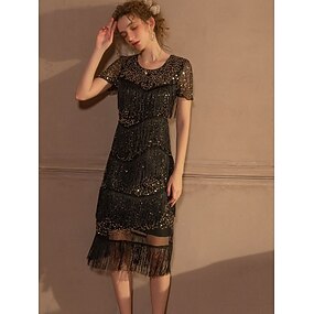 Années Folles Années 1920 Mi-long Robe Charleston Manches courtes Gatsby le Magnifique Fille Flapper Paillettes Frange Fourreau Colonne Col en V Déguisement Femmes Noël Carnaval Soirée Mariage bar