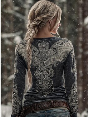 T-shirt femme Sorcière À manches longues Col en V Longs Manches Graphique Décontracté Vintage Chic Western Tops Quotidiens Week-end Vêtements de Vacances Imprimé Noir Blanc Vert Gris Printemps