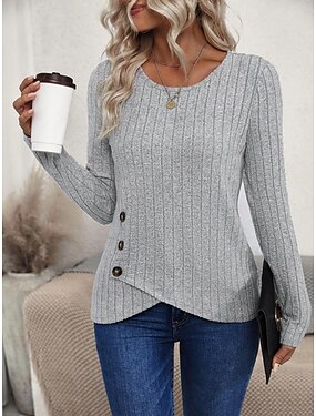 Femmes Chemisier Boutons Couleur Unie Élégant Occasionnel manche longue Col ras du cou Hauts Réguliers Quotidien Noir Blanche Jaune bleu marine Gris Printemps Automne Hiver