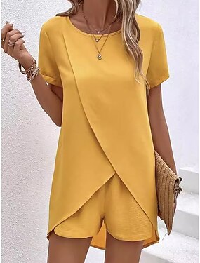 Femmes Ensembles de Shorts Manche Courte Col ras du cou Uni Froncé Cuisse fendue Vacances Mode Streetwear Occasionnel Quotidien Extérieur Noir Jaune Gris foncé Été Coupe régulière