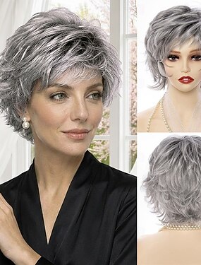Perruque courte ondulée gris argenté pour femme - cheveux synthétiques blancs et gris mélangés, dégradés naturels, avec frange