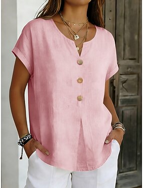 Femmes Chemisier Faux coton lin Boutons Couleur Unie Élégant Basique Occasionnel Manche Courte Col en V Hauts Réguliers Quotidien Bleu Noir Blanche Rose Claire Violet Été Printemps