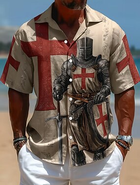 Homme Chevaliers Templiers Croisés Croix Chemise Chemise Boutonnée Manche Courte Vintage Rétro Vêtements de rue Vacances Été Printemps Col Rabattu Impression 3D chemises à col Bleu Kaki Gris