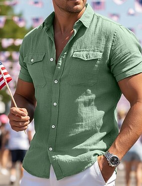 Homme Chemise Chemise en lin Chemise d'été Chemise de Plage Couleur Unie Occasionnel Quotidien Vert Gris Claire Bleu clair Manche Courte Col rabattu Été Printemps & Été Vêtement Tenue Avec Poches