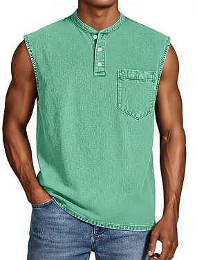 Homme Débardeur T-shirt en coton T-shirt sans manches Sans manches Henley Été Uni Mode Designer Basique Avec Poches Teinture en vêtement Délavé Occasionnel Vacances Rue Noir Vert Claire Rose dragée