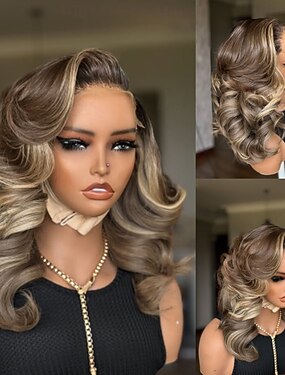 Perruque brésilienne Remy en cheveux humains avec closure 5x5, lace front 13x4 et mèches blond miel, ondulée, blonde-brune avec baby hair, sans colle et pré-épilée.
