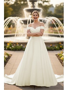 Robes de mariée Ligne A Épaules Dénudées Demi Manches Traîne Balayage Satin Robes de mariée Avec Froncé Couleur Unie