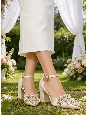 Escarpins de mariage à talons carrés en satin ivoire pour femmes, chaussures de mariée formelles à bout pointu ornées de perles pour des cérémonies élégantes