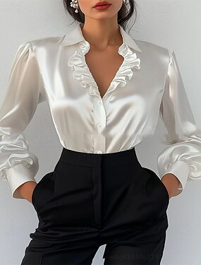 Femmes Elegant Haut en satin Chemisier Hauts Élégants Froncé A Volants Patchwork Uni Élégant ancien Dames manche longue Col de chemise Hauts Réguliers Quotidien Travail Fête Blanche Été Printemps