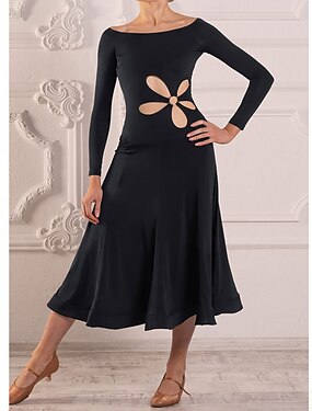 Robe de danse de salon pour femme, manches longues, découpes, moderne, tango, valse, latine, compétition – noire