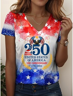 T-shirt femme patriote américaine du jour de l'indépendance impression graphique drapeau national vintage stylé classique à manches courtes col rond hauts réguliers quotidien weekend bleu blanc beige
