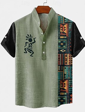 Homme Formes Géométriques Ethnique Kokopelli Chemise Chemise boutonnée Manche Courte Vintage Rétro Fête Décontracté Quotidien Été Printemps Col montant Col Henley Impression 3D Chemise en lin Kaki