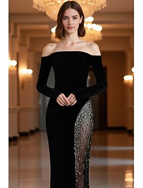 Robe Fourreau Colonne Longueur Plancher Robe de Soirée Élégante Manches Longues Hors des Épaules Soirée Fête Mariage avec Cristaux Perles