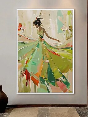 Peinture à l'huile abstraite faite à la main sur toile représentant une femme danseuse, peinture d'art blanche, peinture texturée beige, fille élégante avec robe blanche, peinture de personnes,