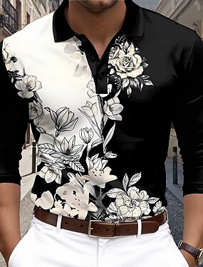 Homme Fleuri Polo Polos de Golf manche longue Polos Col Vêtement décontracté de travaile Vacances Tenue de soirée Tenue Quotidienne Boutons Impression 3D Printemps Automne Hiver Noir