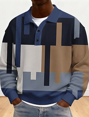 Homme Bloc de Couleur Géométrique Chemises Polo Gaufre manche longue Polos Revers Vêtements de sport Occasionnel École Athleisure Tenue quotidienne Impression 3D Printemps Automne Hiver Bleu Marron