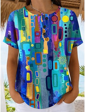Femmes T-shirt Imprimé Boutons de poitrine Marbre Élégant Moderne Occasionnel Manche Courte Henley Hauts Réguliers Quotidien Bleu Jaune Violet Vert Été Printemps