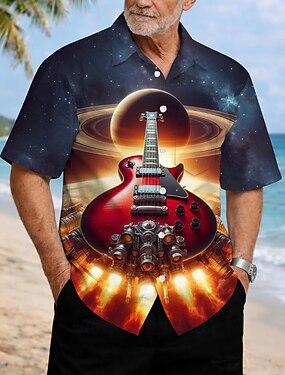 Homme Guitare Planète Chemise Chemise d'été Chemise Boutonnée Manche Courte Vintage Rétro Vacances Festival de Musique Été Printemps Col Rabattu Impression 3D chemises à col Une poche avant Bleu de