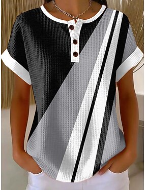 T-shirt en gaufre pour femmes impression graphique géométrique vintage élégant classique à manches courtes col rond hauts réguliers quotidiens bleu noir rose vert été printemps