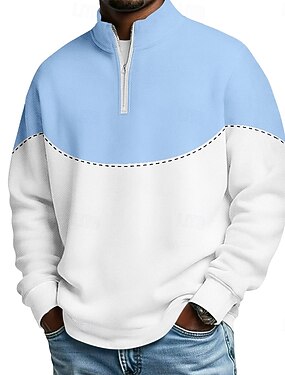 Homme Bloc de Couleur Polos à zip manche longue Polos Col grand-père Occasionnel École Athleisure Fête Tenue quotidienne Impression 3D Polo à fermeture éclair 1/4 Automne & Hiver Printemps Bleu Noir