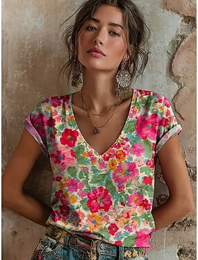 Femmes T-shirt Imprimé Fleuri Graphique ancien Élégant Classique Manche Courte Col en V Hauts Réguliers Occasionnel Quotidien Sortir Bleu Jaune Rouge Violet Orange Été Printemps