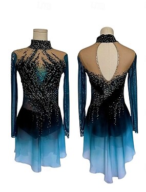 Robe de patinage artistique Femmes Fille Patinage Robe Bleu Noir Patchwork Dos Nu Maille Spandex Haute Élasticité Entraînement Compétition Tenue de Patinage Classique cristal pailleté manche longue