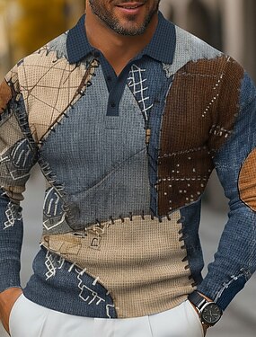 Homme Bloc de Couleur Chemises Polo Gaufre manche longue Polos Chemises à Col Occasionnel Tenue quotidienne Impression 3D Boutons Printemps Automne Hiver Bleu Marron Gris