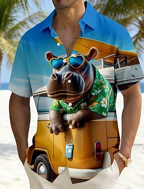 Homme Animal Dessin animé Hippopotame Chemise hawaïenne Chemise Boutonnée Chemise Aloha Manche Courte Drôle Vacances Fête Tenue de plage Été Printemps Col Rabattu Impression 3D Chemise en lin Bleu