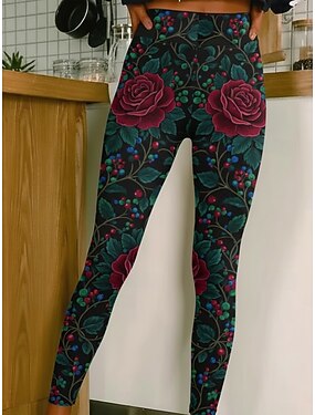 Femmes Leggings Leggings confortables Vacances ancien Style Ethnique Longueur complète Taille haute Graphique Rose Impression Confort Confortable Élastique Occasionnel Quotidien Vacances Vert fonc