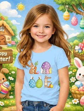 100% Coton Pâques Enfants Fille Bleu Noir Blanche Graphique Lapin T-shirt Col Rond Manche Courte Quotidien Extérieur Vêtements de rue Actif Occasionnel Impression Été Printemps