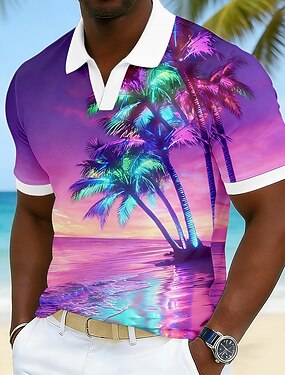 Homme A Ombre Palmier Polos Hawaïens Manche Courte Polos Col en V Occasionnel Resort Athleisure Tenue quotidienne Vêtements de vacances Impression 3D Printemps & Été Bleu Rose Claire Violet
