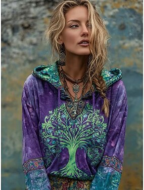 Femmes Sweat à capuche Fleuri Graphique ancien Occasionnel Boho manche longue À capuche Hauts Réguliers Rue Tenue Quotidienne Patchwork Imprimé Poche Avant Violet Printemps Automne Hiver