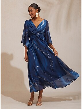 Robe longue femme bleu galaxie dégradé imprimé col V devant nœud torsadé manches trois-quarts évasées voyage vacances