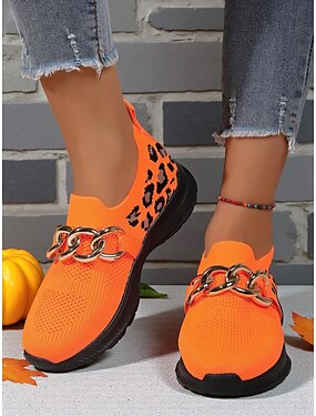 Baskets Flyknit orange à enfiler pour femme avec imprimé léopard et détail chaîne – chaussures à semelle épaisse tendance pour Halloween, les festivals et le streetwear