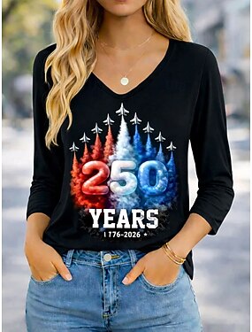 Jour de l'Indépendance Américaine Femmes T-shirt Imprimé Graphique Drapeau Américain ancien Élégant Classique manche longue Col en V Hauts Réguliers Quotidien Week-end Bleu Noir Bleu Poudré Rouge