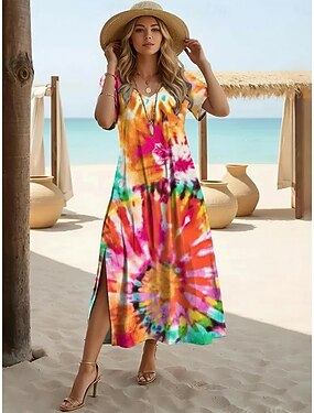 Femmes Robe Maxi Robe Décontractée Robe trapèze Robe Imprimée Mode Moderne Extérieur Vacances Week-end Coupe régulière Graphique Teinture par nouage Manche Courte Col en V Orange Été Printemps