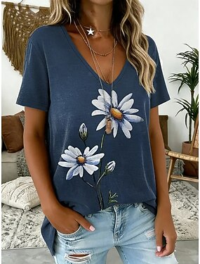 Femmes T-shirt Imprimé Fleuri Graphique Plantes ancien Élégant Occasionnel Manche Courte Col en V Hauts Réguliers Quotidien Week-end Bleu Bleu / Violet Blanche Jaune Rose Claire Été Printemps