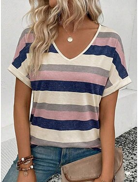 Femmes T-shirt Imprimé Graphique Géométrique Rayé ancien Élégant Classique Manche Courte Col en V Hauts Réguliers Quotidien Week-end Vêtements de vacances Rose Claire Été Printemps
