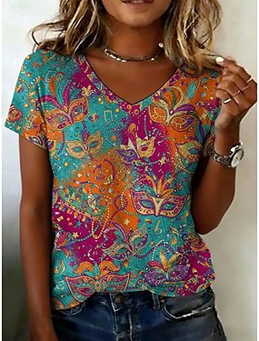 Carnaval Femmes T-shirt Imprimé Graphique Abstrait ancien Occasionnel Manche Courte Col en V Hauts Réguliers Quotidien Week-end Vêtements de vacances Bleu Été Printemps